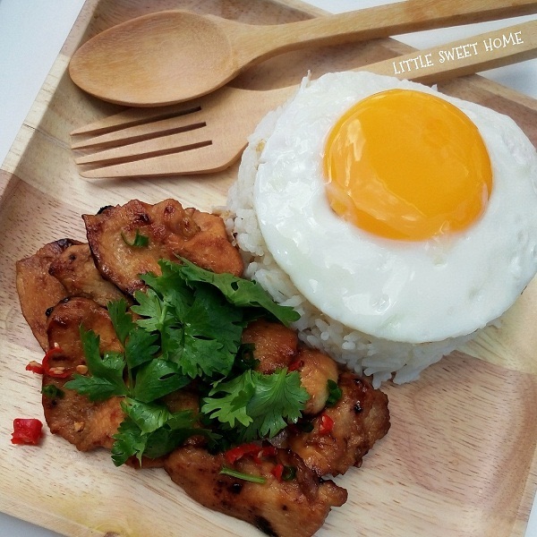 . 2. Then grill the chicken in a Teflon pan until cooked. Transfer to a plate and sprinkle with spring onions and chopped coriander. Add 1 finely chopped bird’s eye chilli for a satisfying taste. Eat with brown rice and fried eggs. (I ran out of brown rice in the recipe, so I ate white rice instead.)