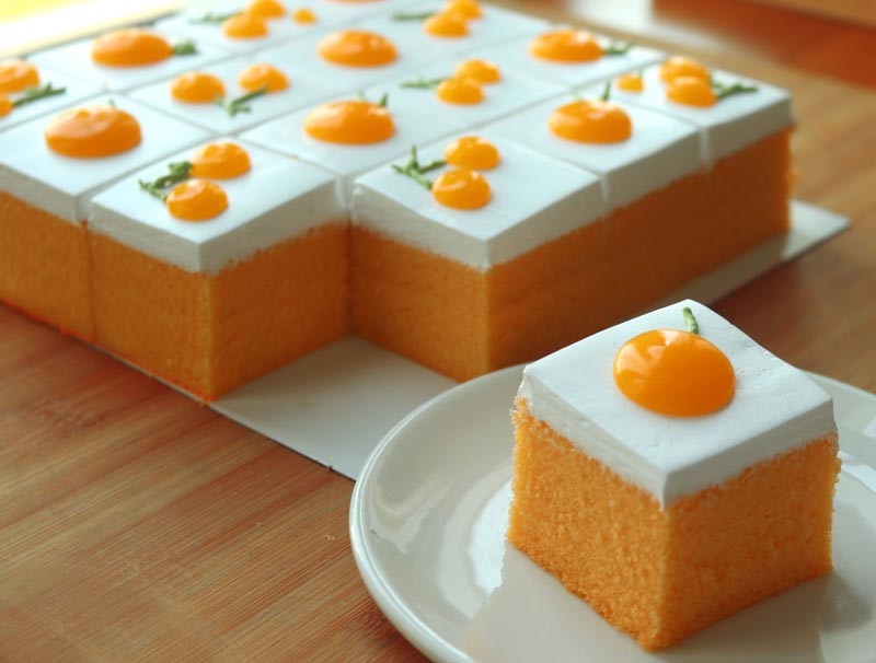 Orange flavor tray cake, cake recipe baked from egg whites. Spread fresh cream and garnish with orange sauce. It’s good to make a living or make a profit by selling it.